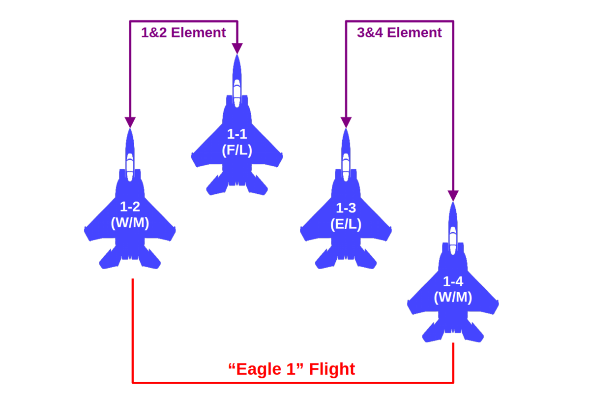エレメントとは編隊の最小単位で、2機で1エレメントです。エレメントはリード+ウィングマン(W/M)で構成されています。エレメントの長機はエレメントリード(E/L)といい、通常は3番機が務めます。つまり、F/LとE/LがそれぞれW/Mを従えているという構図になります。