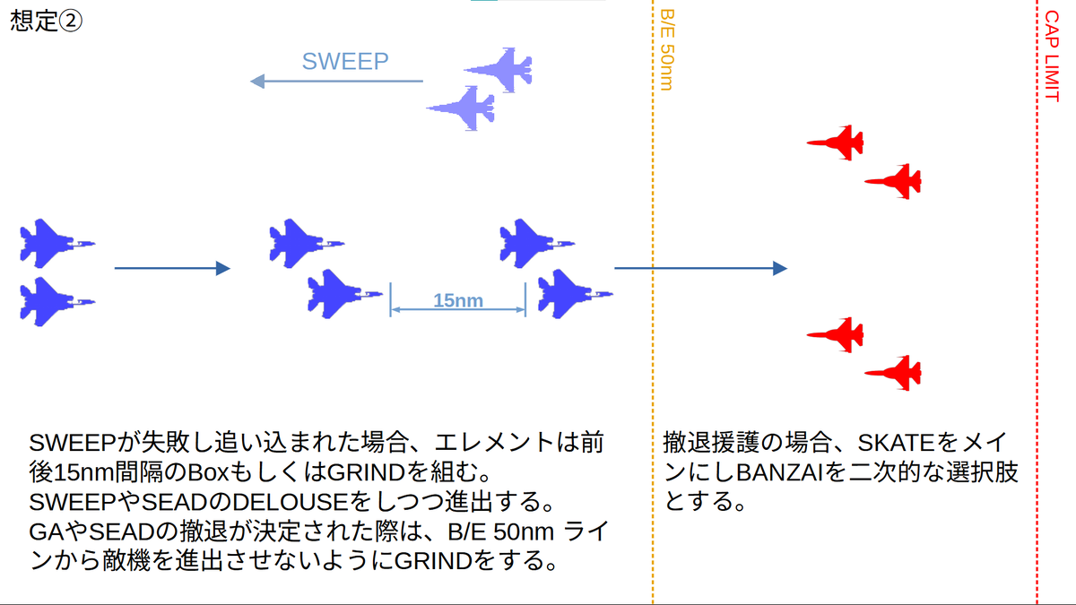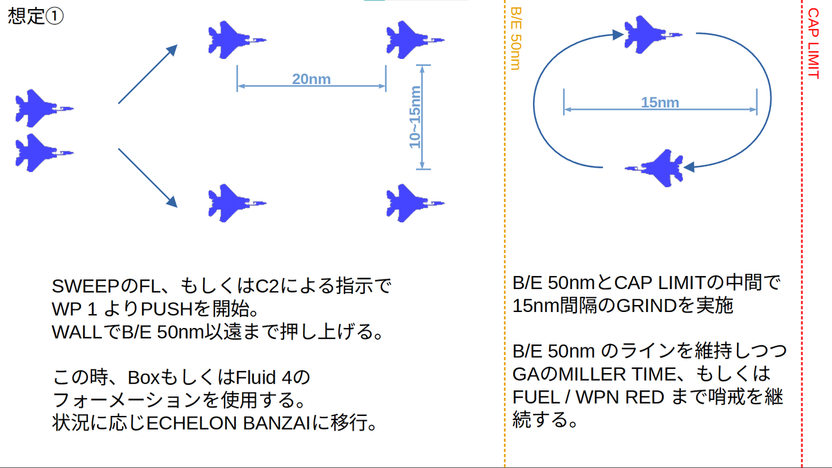例えば「どういう方針で戦闘するのか」「こういう場合はどう動くのか」「基本とする諸元」などを、予めまとめてフライト全体に共有すると良いです。